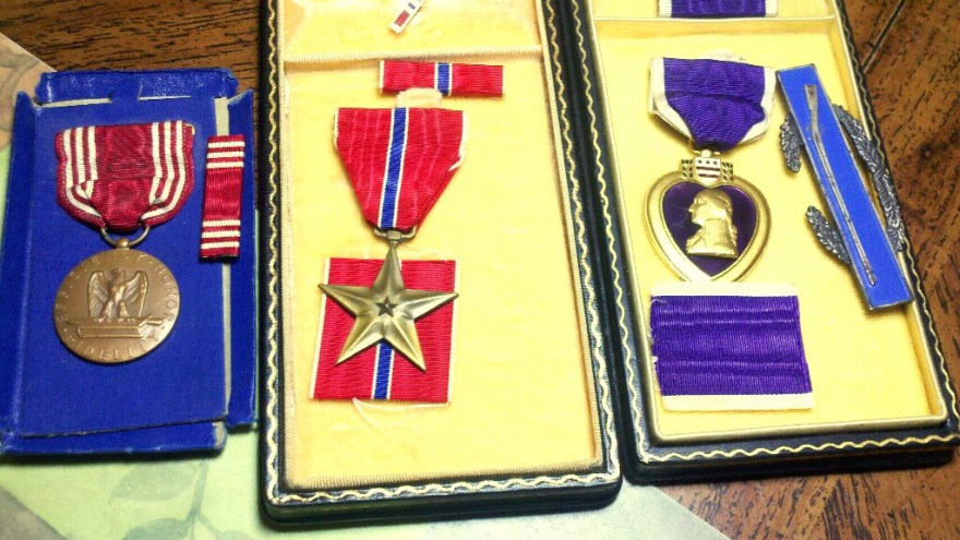 My neice, Jenny, sent Pop his medals that my brother had left behind in MD. They are: Good Conduct, Bronze Star and Purple Heart. Pop was shot after only 16 days in battle. He was getting a cot to move a wounded soldier when he got hit.