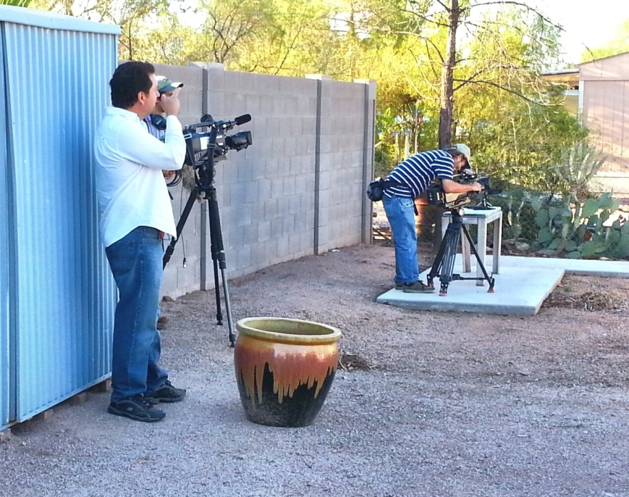 The film crew is filming the wild lovebirds in our yard. They filmed us photographing the birds and interviewed us!