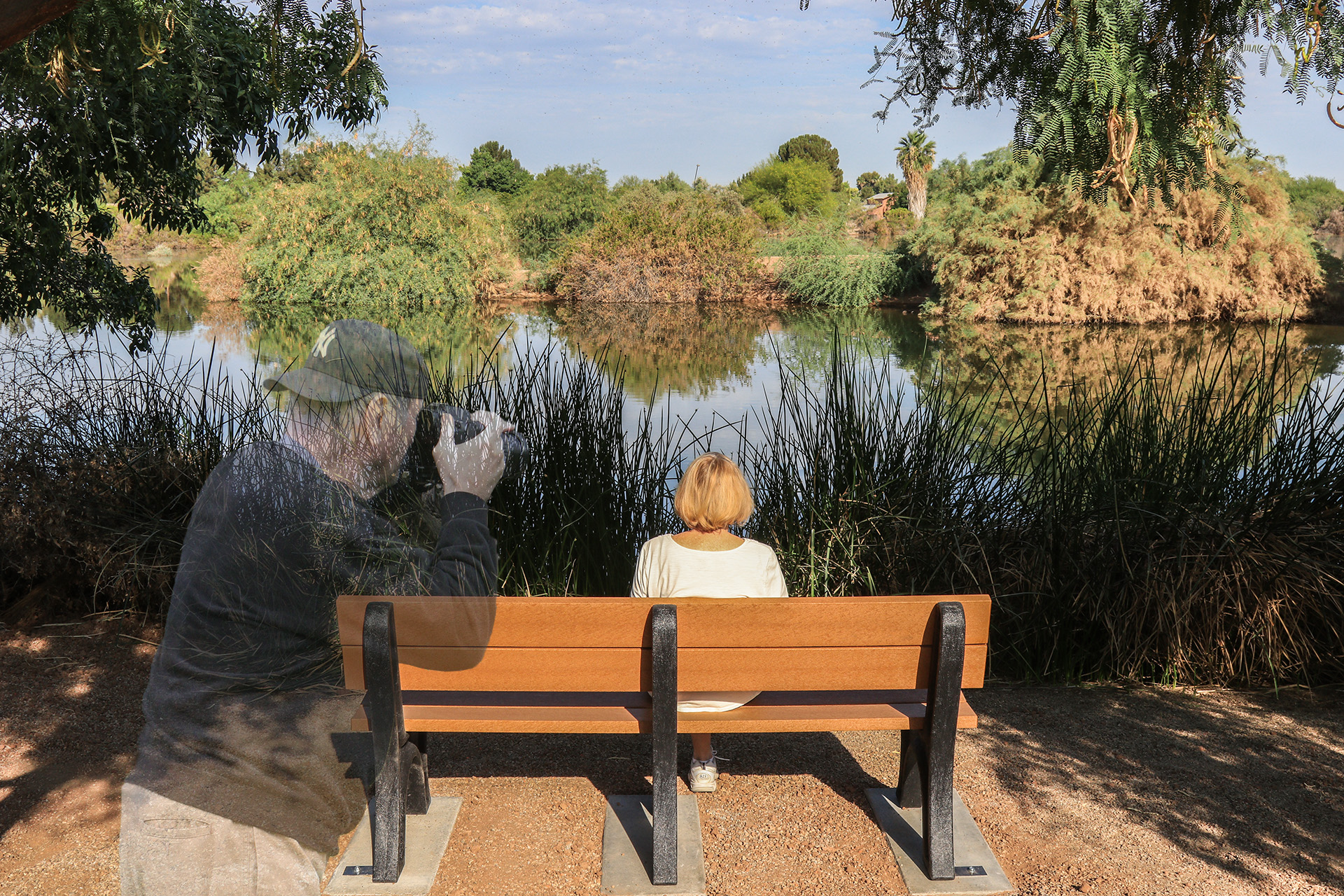 I took this photo of Peggy after the memorial bench for Larry was installed at Gilbert Riparian Preserve. Our mutual friend, Morris (who introduced us to Larry) took the original photo of Larry. With my composite, I was trying to show Larry watching over Peggy. He was an avid photographer, so I felt this was appropriate.