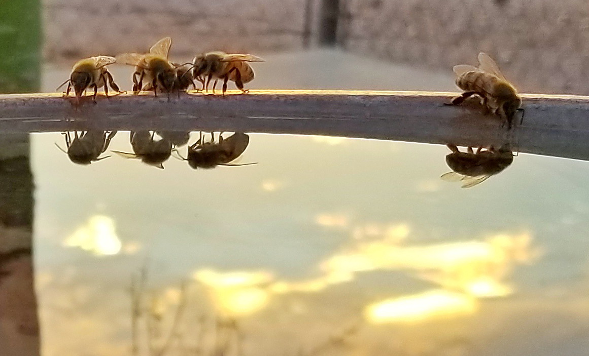 This is a heavily cropped cell phone photo, but I like it (except for the quality). I need to re-recreate this with a real camera. Bees have taken over the bird bath fountain and they’re fun to watch.